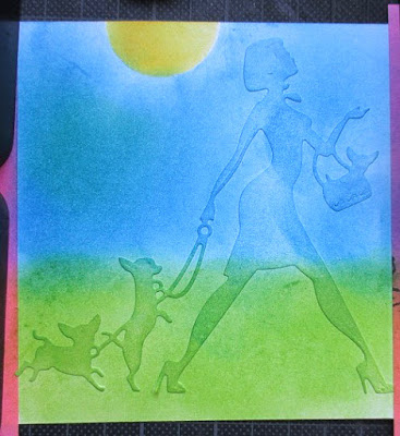 First I Die Cut a Mask using Stamping Mask Paper from Inkandinkado. I masked first the main area that will still white aand sponged this three Distress Inks colors.