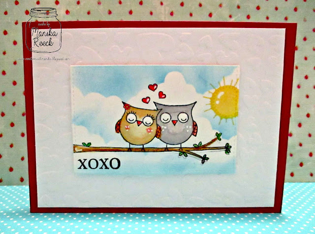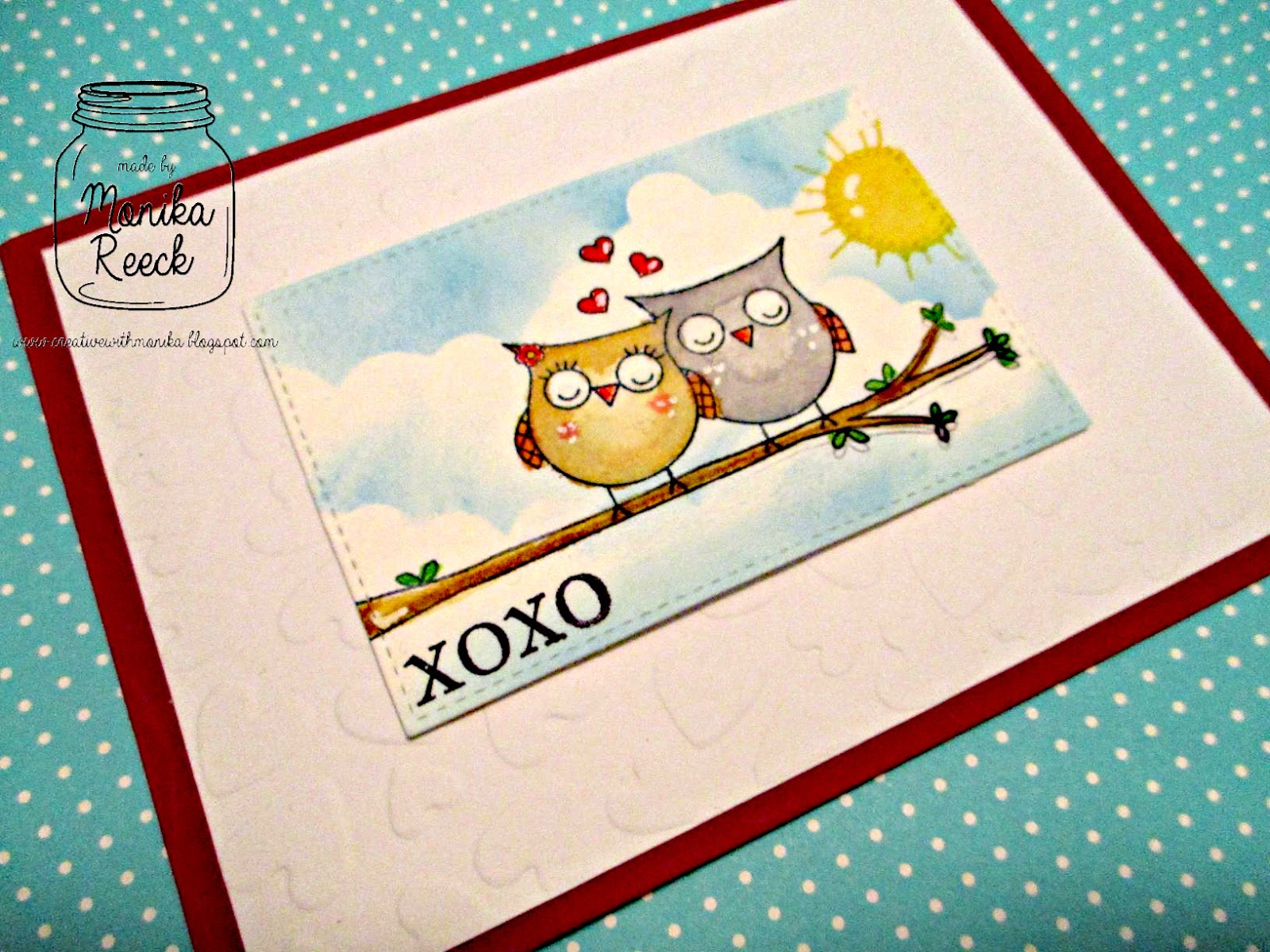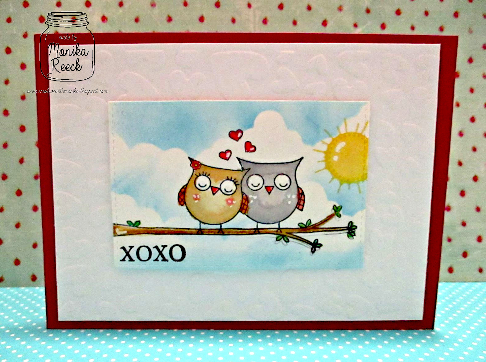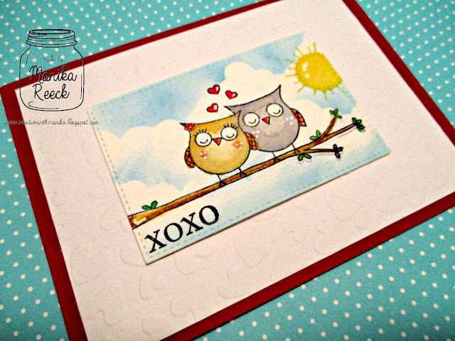 ReplyDeleteBeautiful watercoloring on your hearts and your 'Hugs' die cut is perfect, Monika! I also love those darling owls...especially with your pretty clouds in the background! Two fabulous cards!
