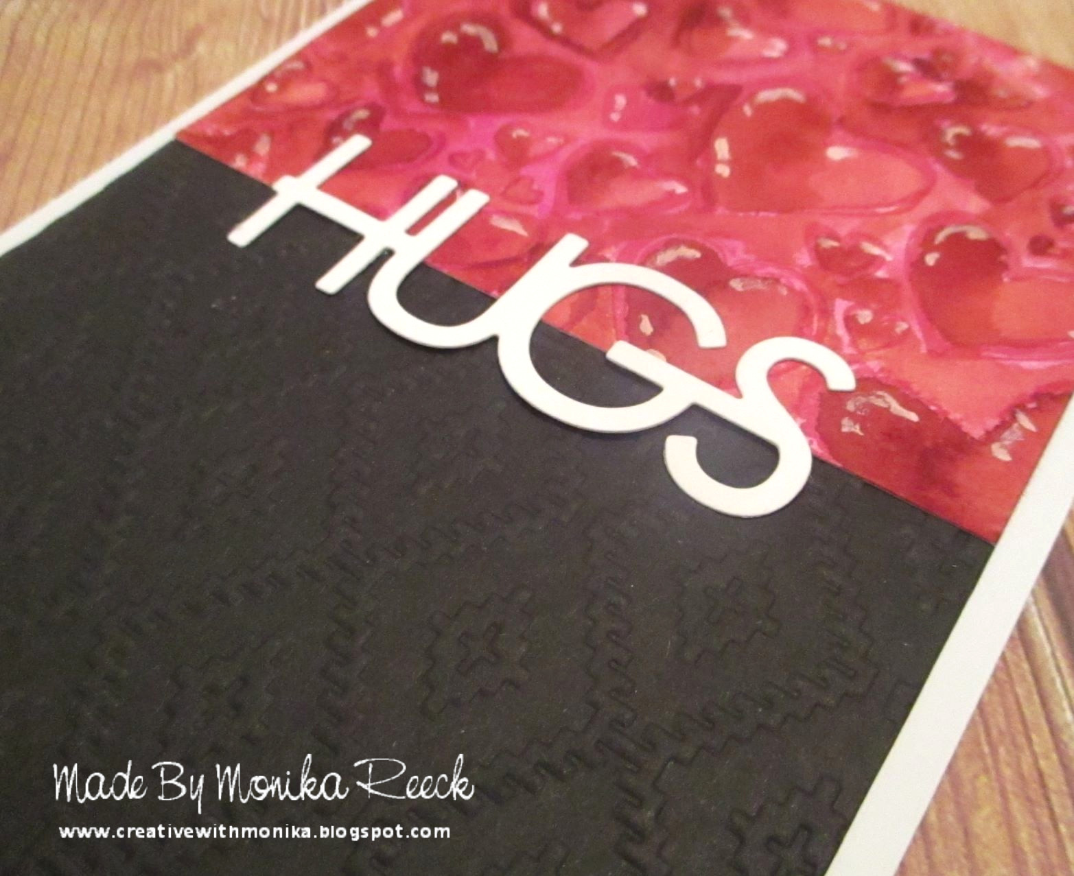 Wow! You made the heart background yourself? It looks fabulous, the hearts look like they’re wet, what a cool finish. Dramatic effect with the black below. Oh, I love this one, Monika.